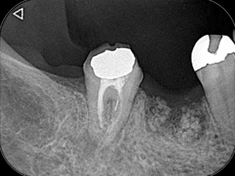 | 所見 | 右下第二大臼歯 根管治療はきちんと行われているわけではなく、ファイルのような異物が根管の中に残っているように思える |